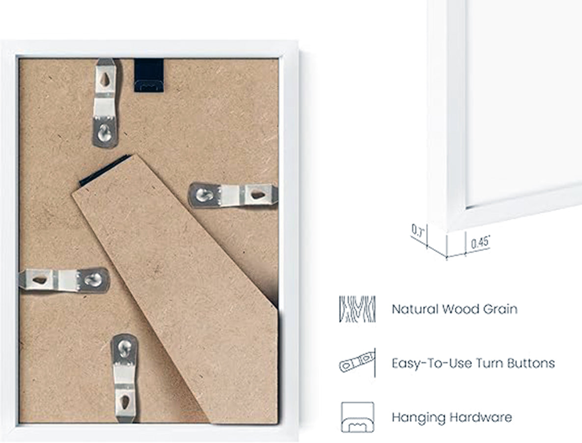 DURABILITY: Our frames are equipped with plexiglass covered by protective film and two metal hangers for horizontal or vertical hanging. For added convenience, our 4x6 wall picture frame is shipped in a durable box, securing their protection throughout transit.